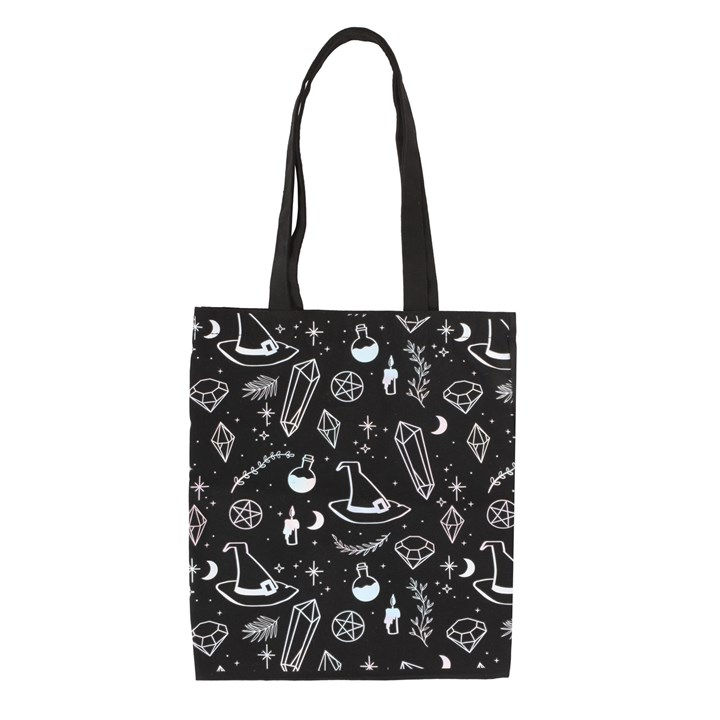 This trendy Polycotton tote bag is a fun and unique gift for any crystal collector or for anyone to stay in touch with their witchy side. Adorned with designs of crystals, witch hats and potions on a black Polycotton canvas. Includes ample space for sustainably carrying everyday essentials or for shopping. Made from 95% Polyestser, 5% Cotton. Hand wash only.